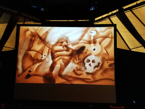 "Murmurations" est un spectacle en perpétuel mouvement où la musique de Takuma se déploie comme un paysage sonore sur lequel Adrien, selon son inspiration, fait naître des tracés et des formes mouvantes se transformant de paysages en personnages sur des lignes d’horizon. Leurs deux univers s’entremêlent alors, et chaque mouvement de matière se meut en un instant en une image inattendue, pouvant susciter étonnement, émerveillement et émotions, telles les murmurations d’oiseaux, ces ballets aériens dessinant des formes mouvantes dans le ciel.